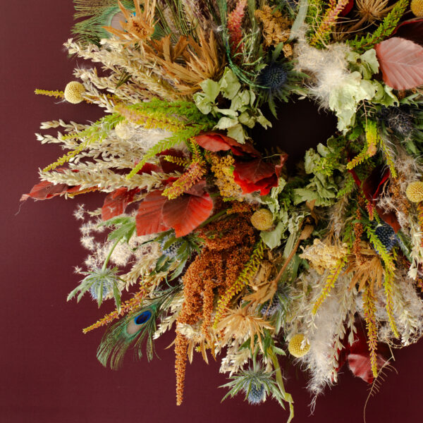 Naturalny, ręcznie pleciony wianek w barwach jesieni. Każda kompozycja pochodzi z naszej autorskiej pracowni. W skład zestawu wchodzi sznurek wraz z przyssawką do mocowania.