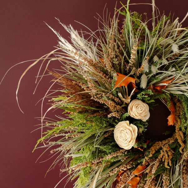 Naturalny, ręcznie wykonany wianek na bazie zróżnicowanych roślin, traw i barwionego suszu. Odpowiedni do dekoracji drzwi lub wybranej ściany. Świetnie sprawdzi się również nad kominkiem. W skład zestawu wchodzi sznurek wraz z przyssawką do mocowania.